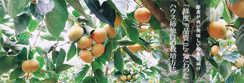 私たちの産地では、古くから甘柿の富有柿が中心でありましたが、本県で育成された刀根柿が増大し、9月中旬からの刀根柿に始まり12月上旬の富有柿までの出荷が定着しました。その中で最も人気の高い刀根柿をハウス化することにより、6月下旬に収穫が始まり2月上旬までの冷蔵柿までの約8ヶ月間の長期出荷が可能になりました。ハウス柿は開花~収穫までの期間が長い為、栄養度が高く、ビタミンが多いことが特徴です。ハウス柿は秋を先取りした、奈良の柿のトップバッターです。